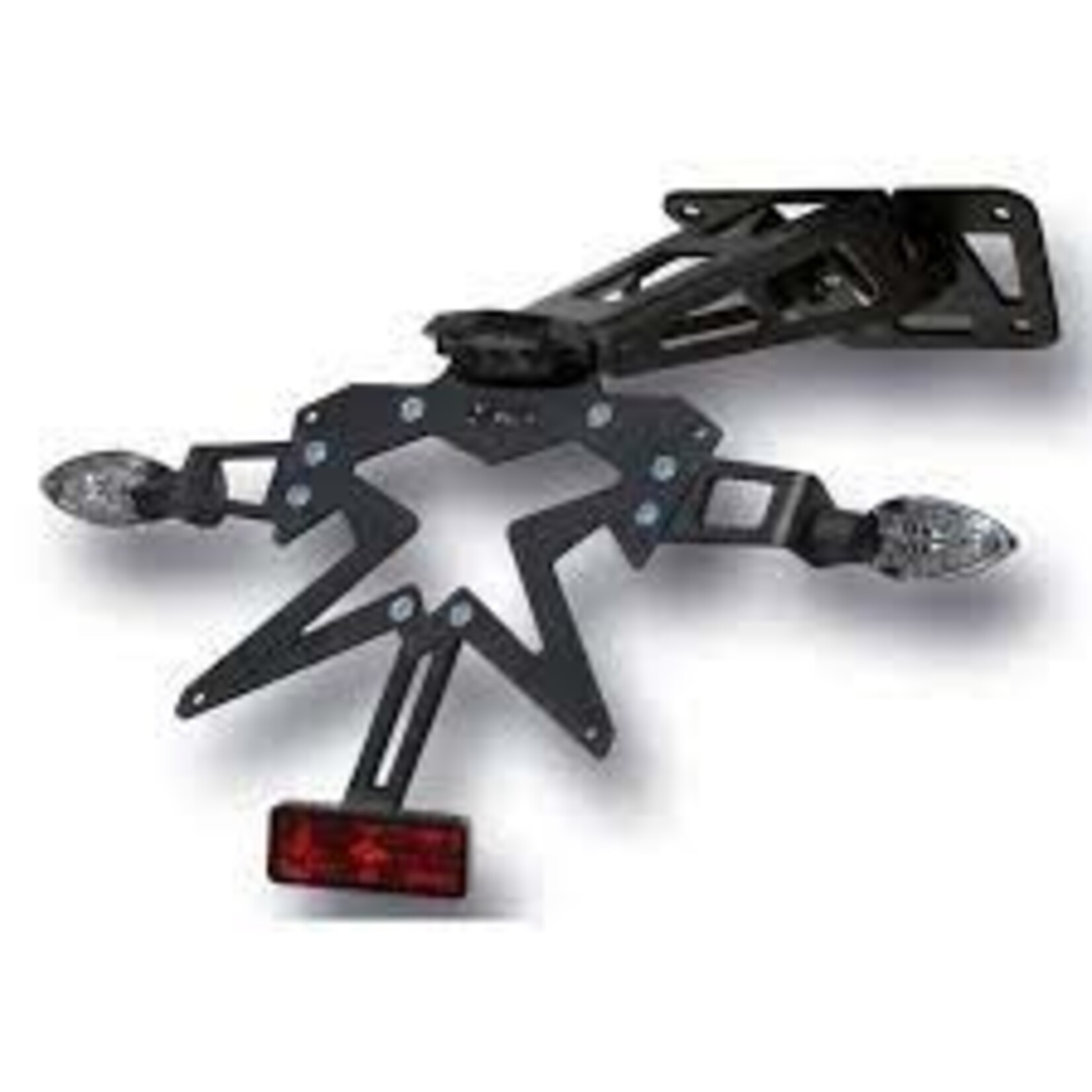 Modellspezifischer Kennzeichenhalter inkl. Kennzeichenleuchte, Rückstrahler und Blinker. Gefertigt aus schwarz pulverbeschichtetem Stahl und mit stufenlos verstellbarem Neigungswinkel. Inkl. Anbauteile, keine Eintragung beim TÜV erforderlich.